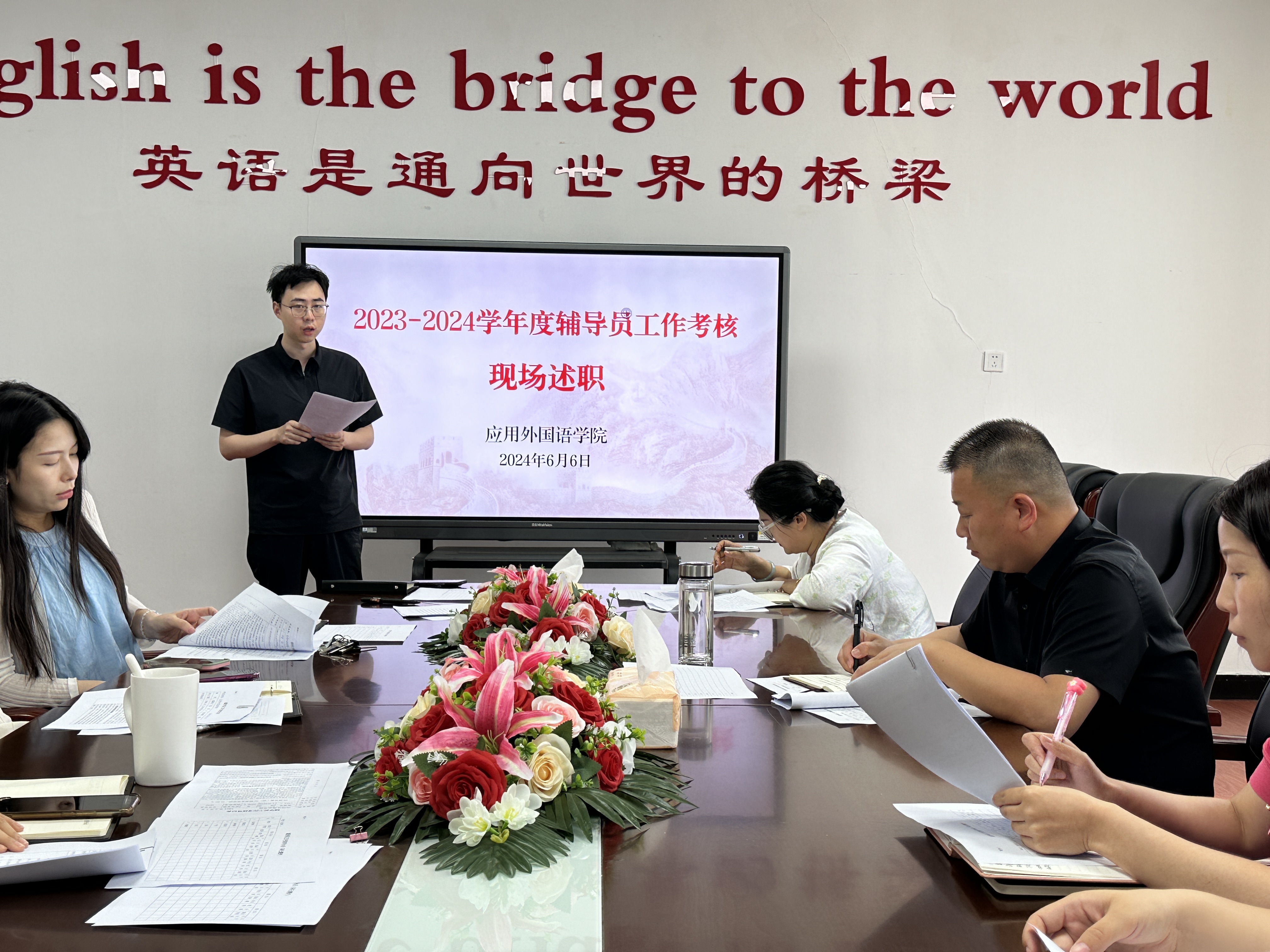 为进一步加强专兼职辅导员队伍建设和管理,检验辅导员履行岗位职责、完成工作情况,全面考核辅导员的德、能、勤、绩,学院于2024年6月6日举行了专兼职辅导员年度工作现场述职会,学院考评工作小组及全体专兼职辅导员参加,会议由副书记张泽锋主持。