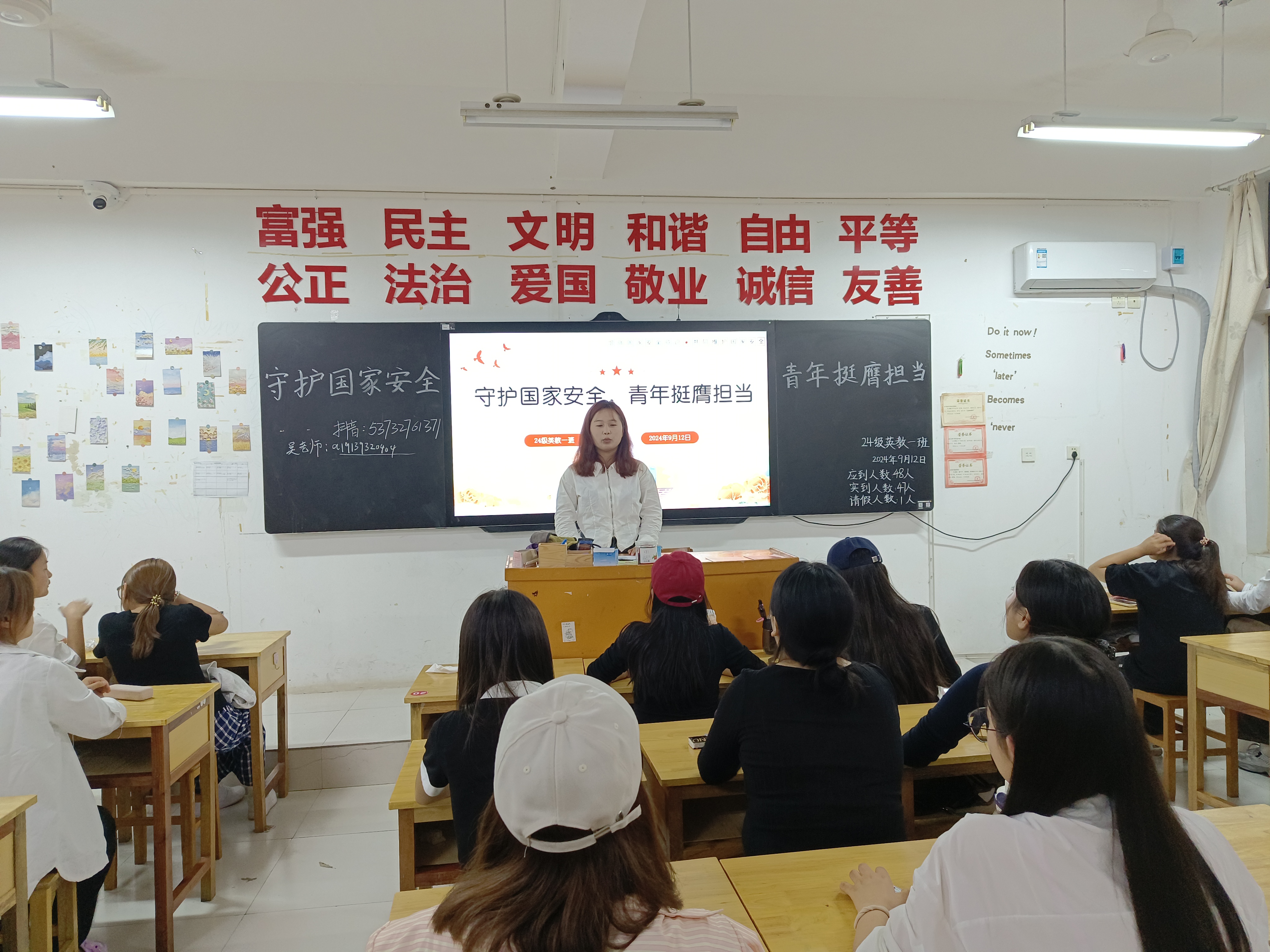 为推进国家安全宣传教育进校园进课堂,提高同学们的国家安全意识和法治素养,澳门网投十大信誉平台于9月12日晚组织召开“国家安全教育”主题班会,班会由各班班长主持。