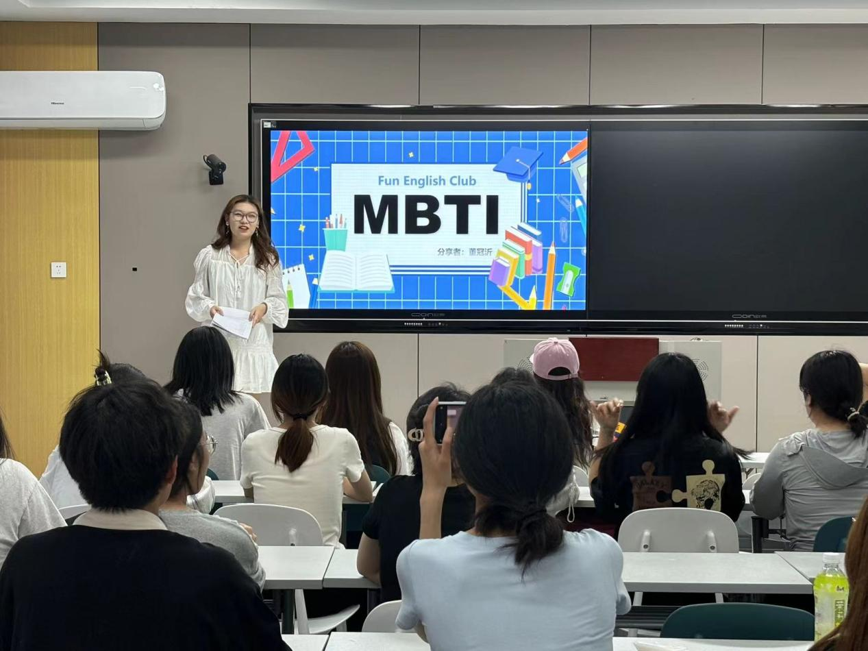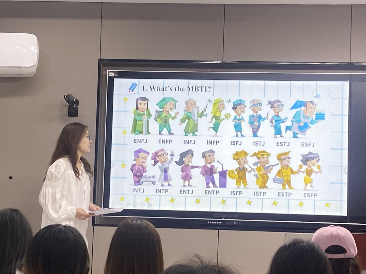 本次活动内容新颖、丰富。“小老师”董冠沂同学首先从 MBTI简介、十六种性格类型的特点、MBTI在日常生活、工作和人际关系中的应用等方面展开分享。然后,董冠沂同学详细讲解了自己对MBTI性格理论的理解,希望帮助社员们提升使用英语交流有关心理学概念的能力。