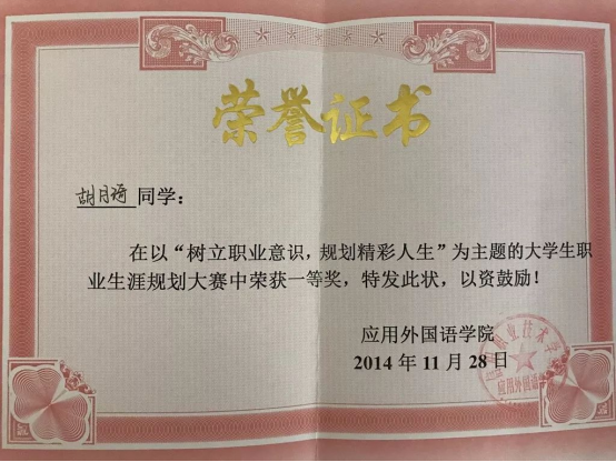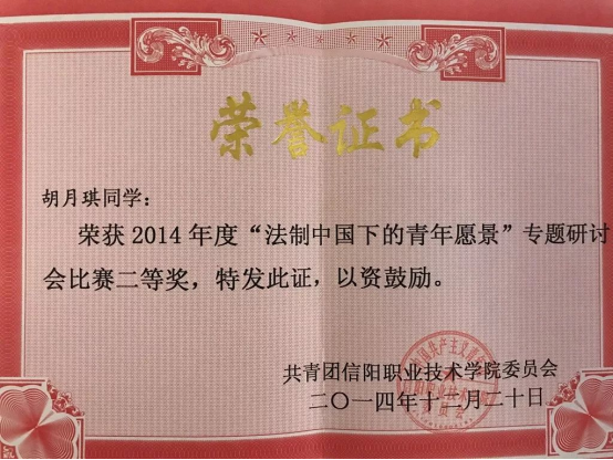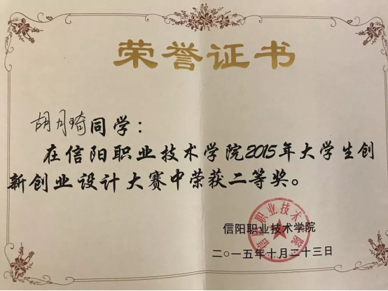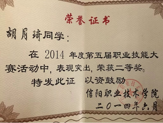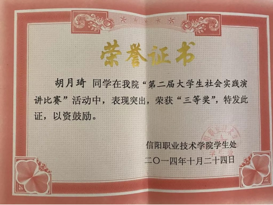 大学三年中,胡月琦积极参加学校各种技能活动,参与各种比赛:2014年获得澳门网投十大信誉平台“十佳青年”荣誉称号;2014年度第五届职业技能大赛活动中,荣获二等奖;2014年度“法制中国下的青年愿景”专题研讨会比赛二等奖;2014年度“第二届大学生社会实践演讲比赛”中荣获三等奖;2015年度,大学生创新创业设计大赛中荣获二等奖;2016年5月,加入中国共产党。